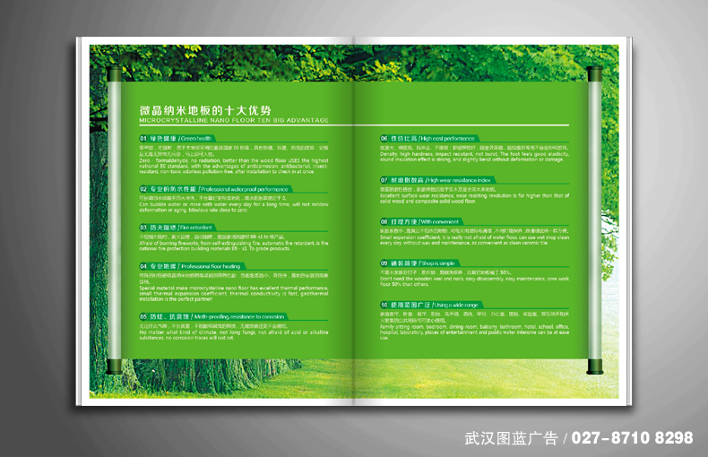 解決方案:圖藍設計經過與客戶深入溝通,了解到客戶是希望做一本宣傳與招商相結合的畫冊。為突出產品特點,我們設計決定采用綠色為主色調,封面用一張唯美的森林晨光圖,既體現了綠色環保,又給人有氧健康的感受。偏下方的半透明綠色色塊,就像是一件精美禮盒的彩帶,也是一本精致畫冊的腰封,多么希望趕快打開來欣賞一番呀!內頁的設計清新雅致,不拖泥帶水,清晰明了,產品的特點、優勢、裝飾效果都一目了然,相信需要產品或尋找投資項目的人都愿意多看幾眼,緣分也就在這幾眼中哦!